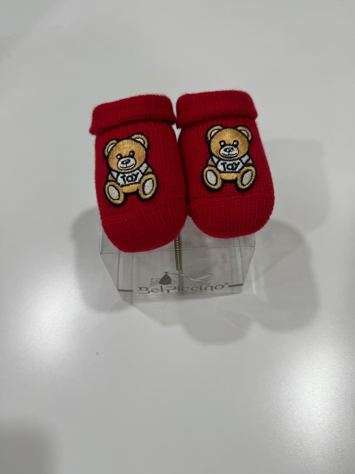 MORBIDI CALZINI ROSSI DA NEONATO CON ORSETTO RICAMATO E SCRITTA “TOY”. CONFEZIONE REGALO FIRMATA BELPICCINO,IDEALE PER LE PRIME FESTE O COME DOLCE PENSIERO PER IL TUO BEBE’
