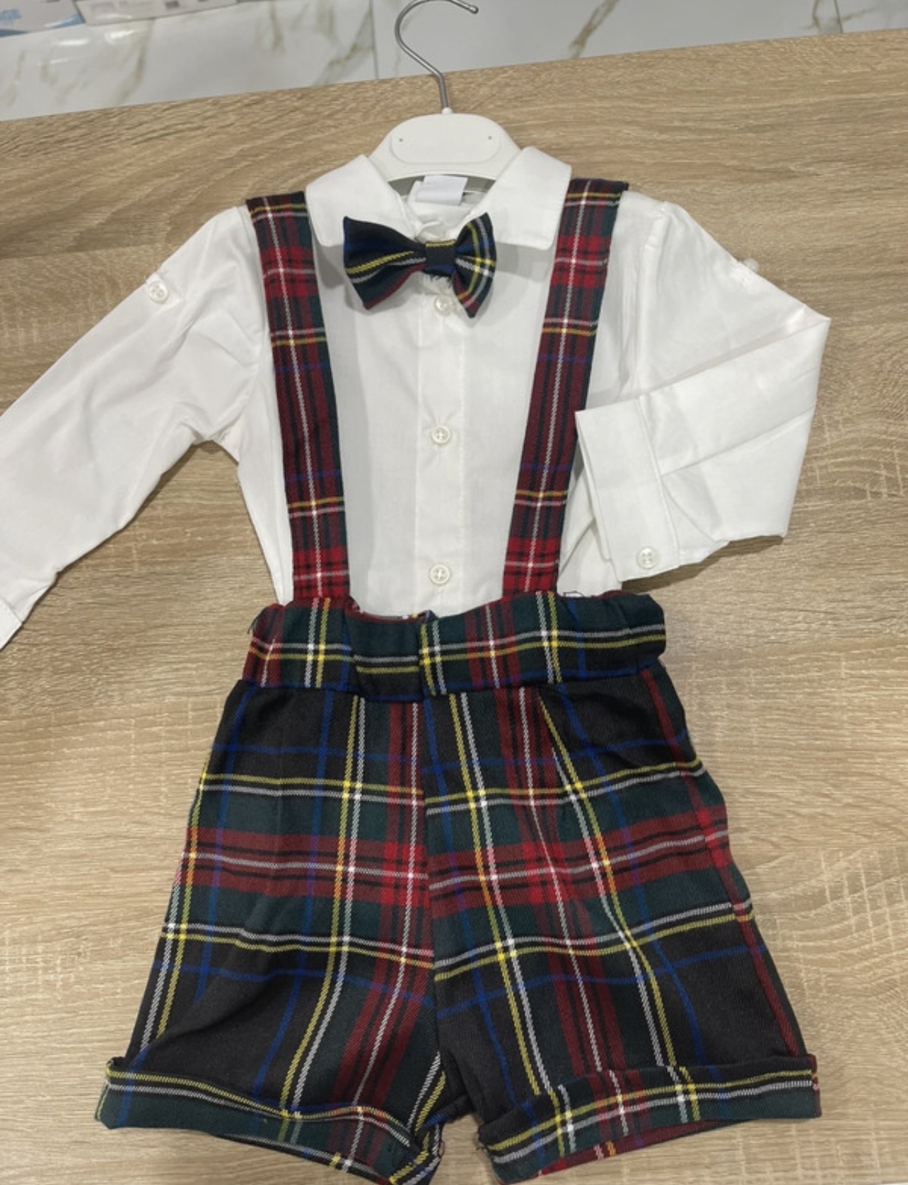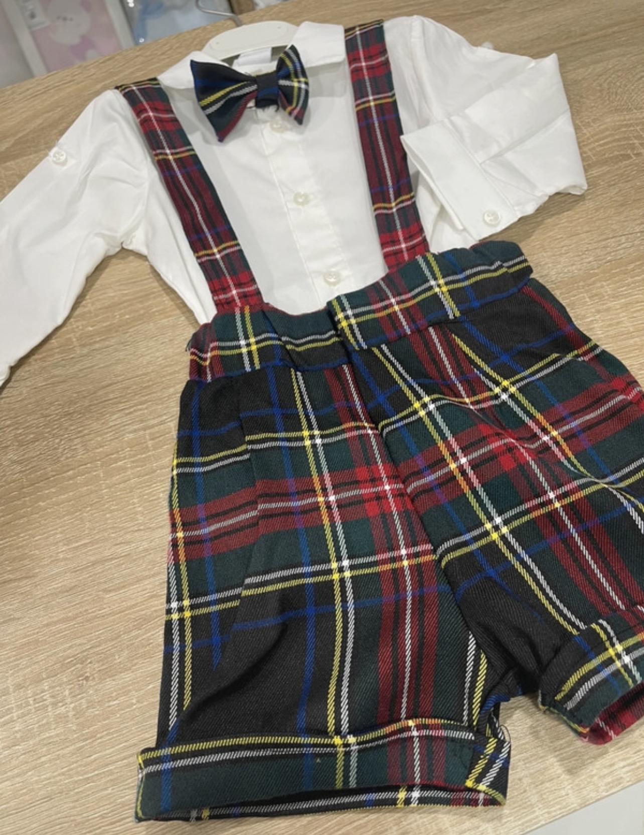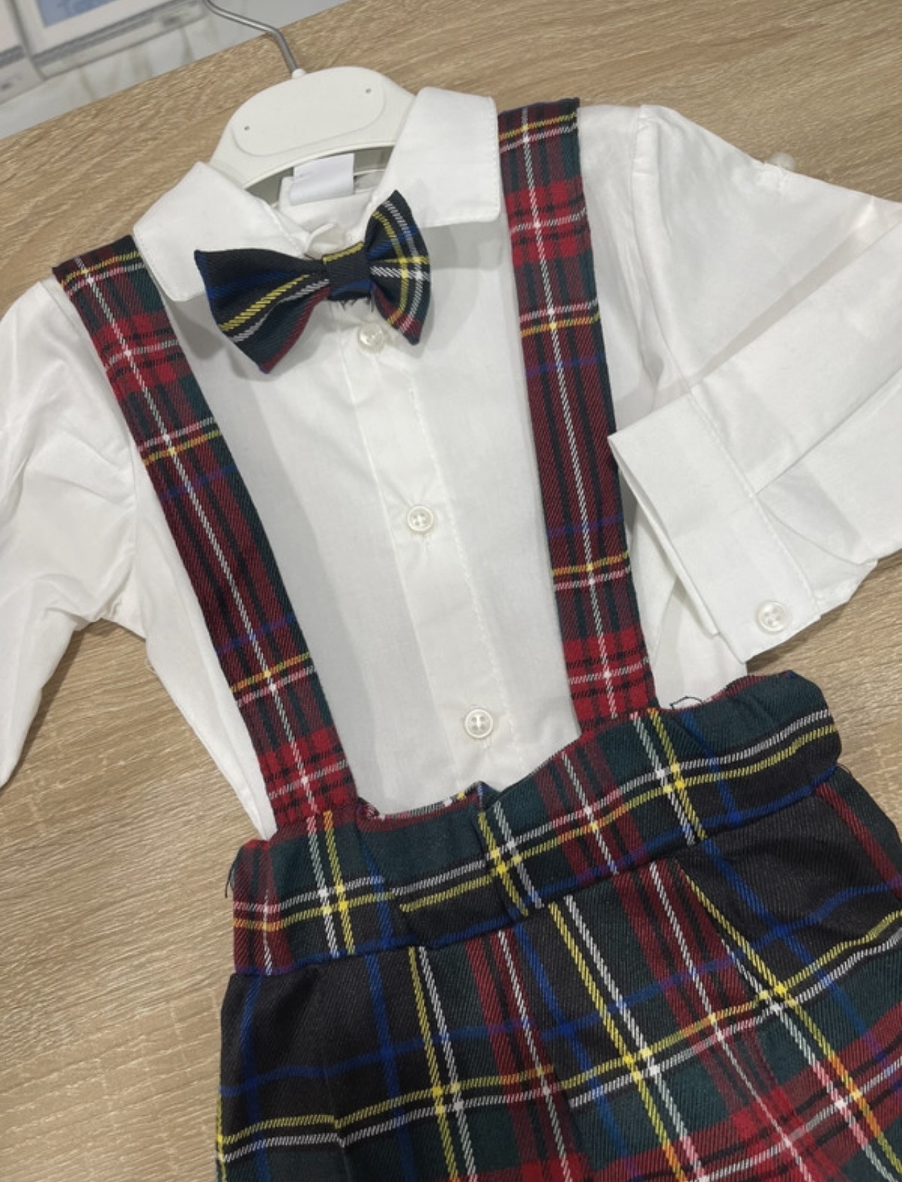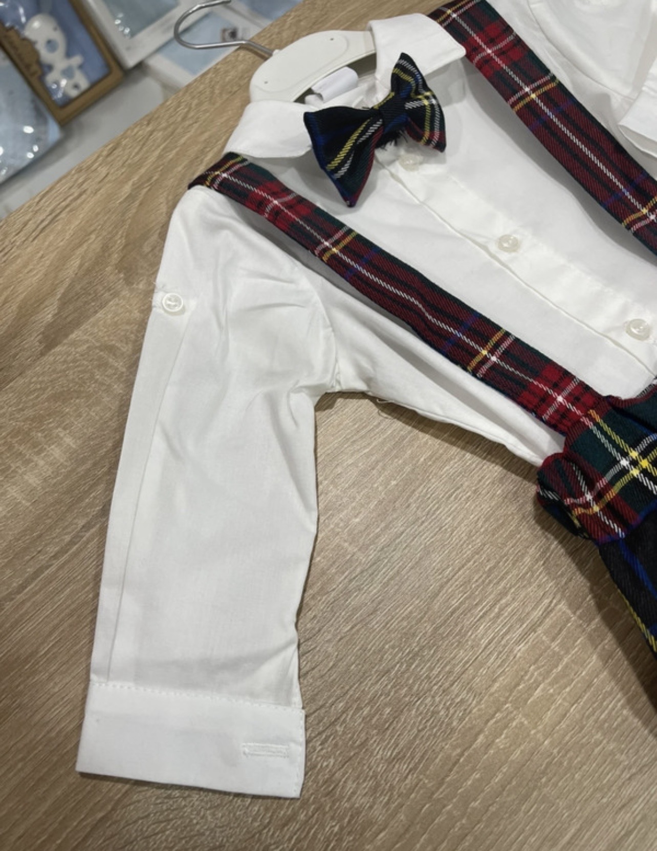 COMPLETO DA BAMBINO CON CAMICIA BIANCA,PAPILLON,BRETELLE E PANTALONI IN FANTASIA SCOZZESE.