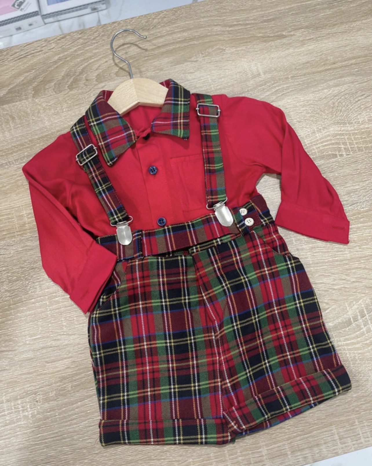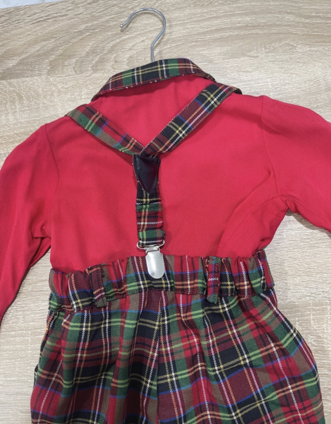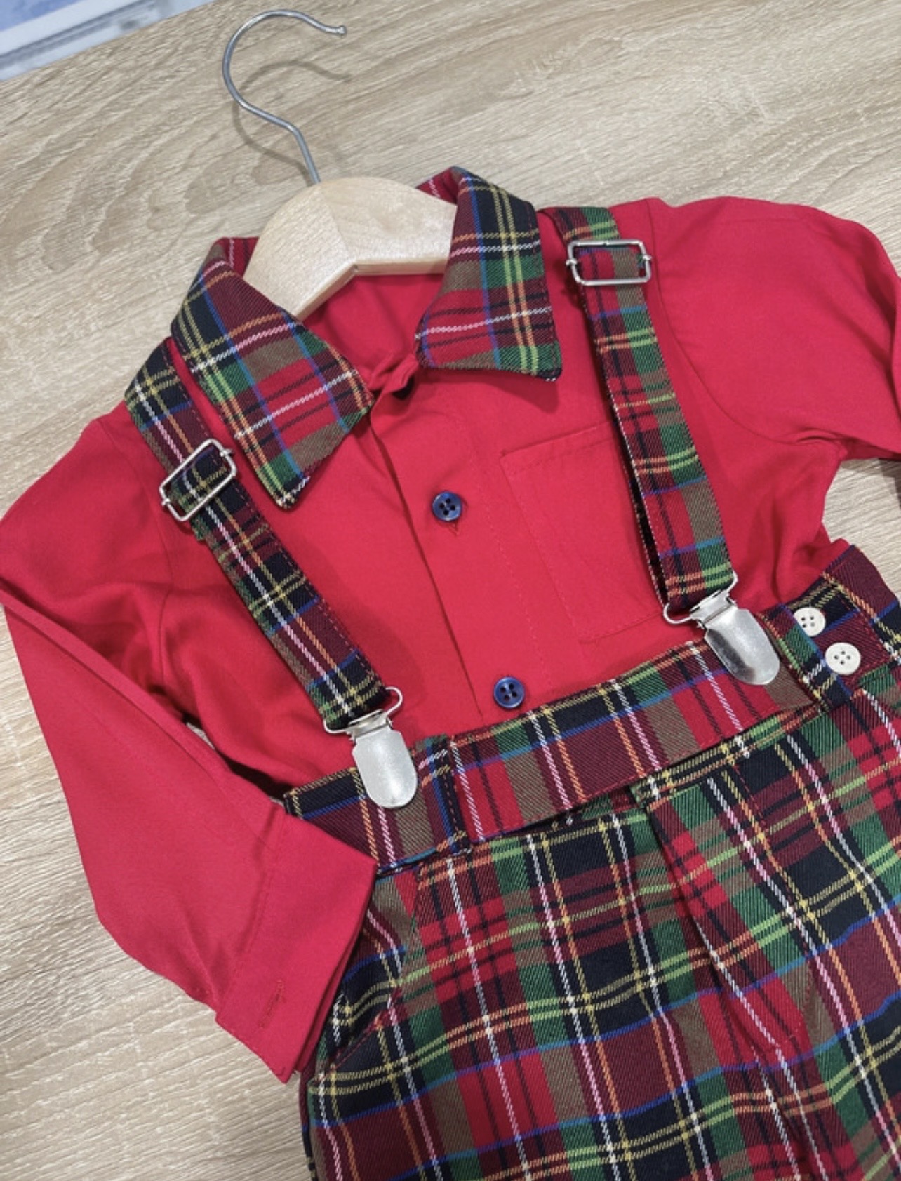 ELEGANTE COMPLETO DA BAMBINO CON CAMICIA ROSSA,COLLETTO E BRETELLE IN FANTASIA SCOZZESE, ABBINATO A PANTALONI COORDINATI. PER0FE0TTO PER LE FESTE E LE OCCASIONI SPECIALI.