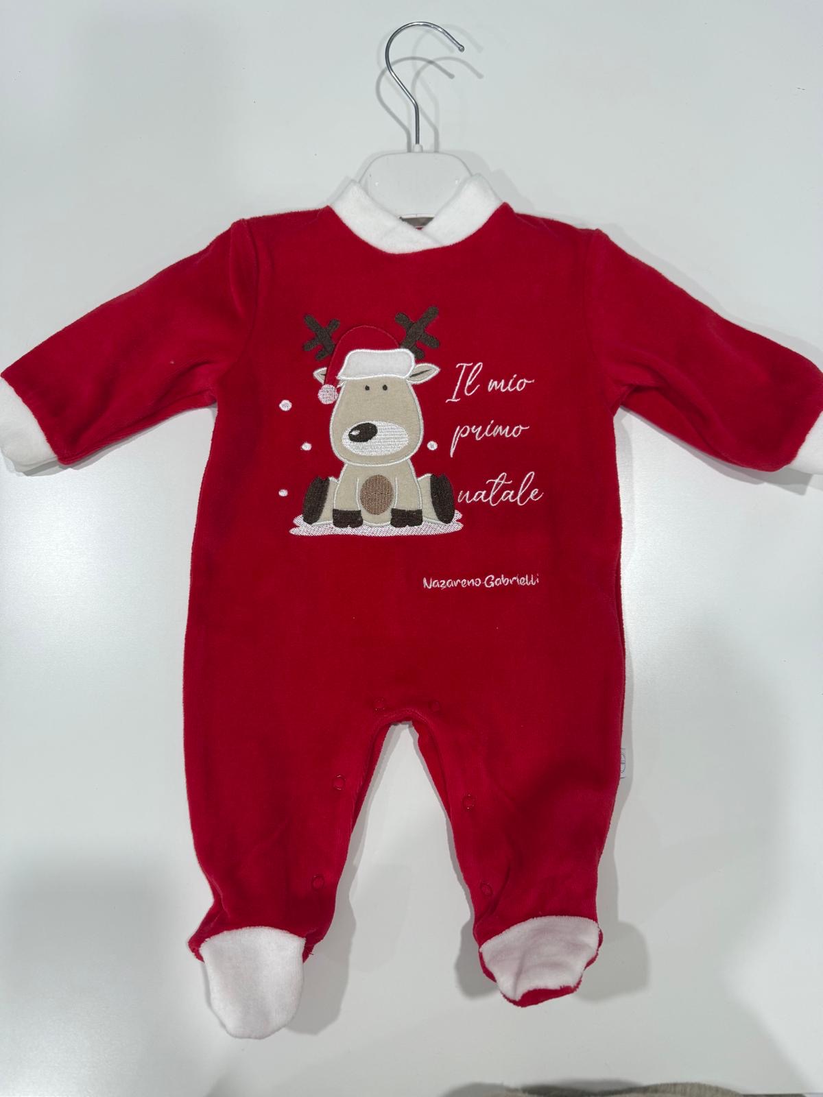 TUTINA ROSSA CON COLLETTO BIANCO E RICAMO NATALIZIO CON RENNA E SCRITTA “IL MIO PRIMO NATALE”. MORBIDA,CALDA E PERFETTA PER FESTEGGIARE IL PRIMO NATALE DEL TUO BEBE’